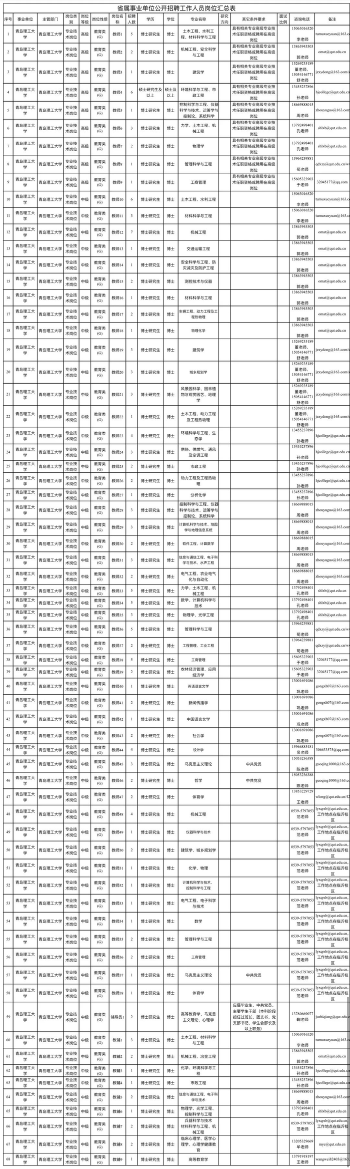 根据省委组织部、省人力资源和社会保障厅《关于做好2021年事业单位公开招聘工作人员有关问题的通知》(鲁人社发〔2020〕155号)、《关于印发2021年度省属事业单位公开招聘工作实施方案的通知》(鲁人社发〔2021〕7号)要求,结合学校实际工作需要,青岛理工大学拟面向社会公开招聘专业技术岗位工作人员159人,其中,高级专业技术人员22人,中级专业技术人员137人。具体岗位及条件要求详见《省属事业单位公开招聘工作人员岗位汇总表》(附件1)。