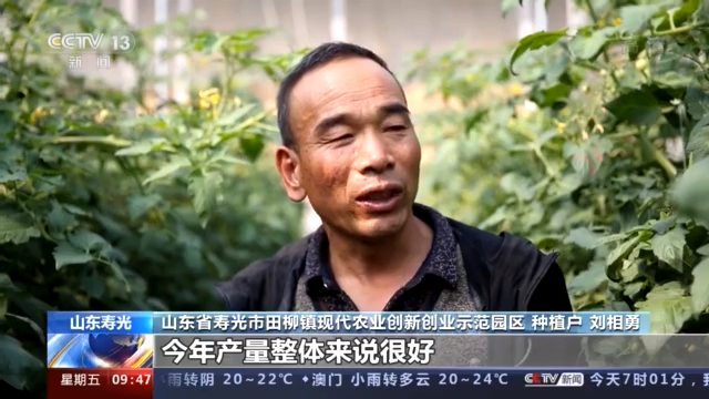山东省寿光市田柳镇现代农业创新创业示范园区种植户 刘相勇:今年产量整体来说很好,气候很适宜,产量很高,总体来说比去年高。像我这个棚正好是产量高峰,一次能摘4000多斤,现在正好客户要的很多,最多的时候能摘5000斤。
