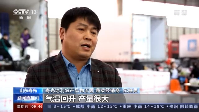 寿光地利农产品物流园蔬菜经销商纪振男:气温回升,产量很大,所以价格下滑。