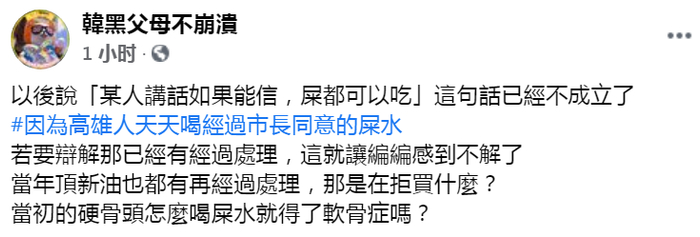 对于高雄民生用水取自“屎尿河”,挺韩国瑜的脸书粉丝专页“韩黑父母不崩溃”9日发文讽刺说:“以后说‘某人讲话如果能信,屎都可以吃’这句话已经不成立了,因为高雄人天天喝经过市长同意的屎水。”↓