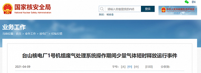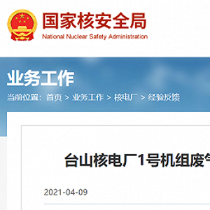 据国家核安全局网站消息,2021年4月5日,台山核电厂1号机处于满功率运行。11:45,营运单位按计划执行废气处理系统某段管线水封充水操作。初次水封充水后,水封未达预期效果;再次水封充水完成后,出现烟囱气体放射性排放剂量率高1报警。13:58:14,烟囱气体放射性剂量率降至高1报警阈值以下,事件结束。
