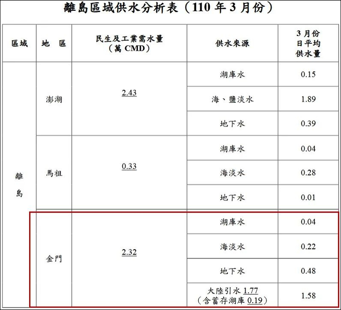 2021年3月金门民生及工业需水量 图源:台当局“水利署”