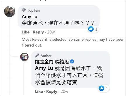 金门县长杨镇浯在去年11月16日的一则脸书帖文中表示,水情吃紧,受惠于大陆供水的支持,民生用水正常供给,让地区家家户户用水不虞匮乏,也或许因此降低了大家的警觉性,“阿牛(杨镇浯自称)要呼吁乡亲一起来省水抗旱。”