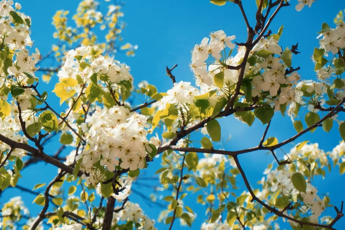 梨花秀丽典雅,盛开时如玉似雪,漫天洁白。