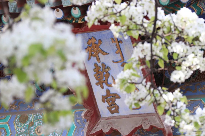 走过这历史的宫墙,细嗅身边的丁香,看那朵朵碧桃粉中透紫,小而精致的杜梨花勾勒着承乾宫的牌子,海棠微微泛出的紫色为它平添艳丽却不俗气。