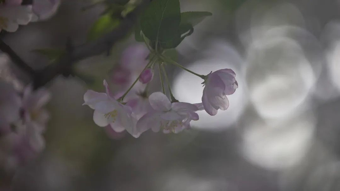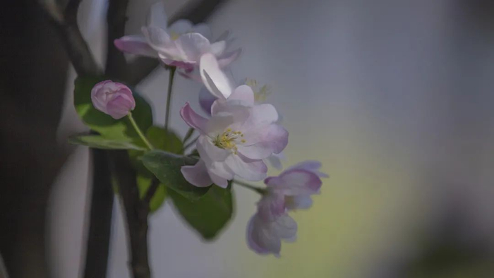 海棠花未开时,花蕾红艳,似胭脂点点;花开后则渐变粉红,如晓霞满天。
