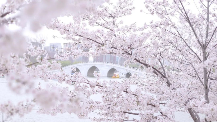 樱花盛开,满树灿烂,薄薄的阳光撒落在恬静的粉红与素白的浪漫中,微风轻拂,大片的花瓣织成一场让人屏息流连的樱花雨。满树灿烂的樱花林,写满了甜美与浪漫。