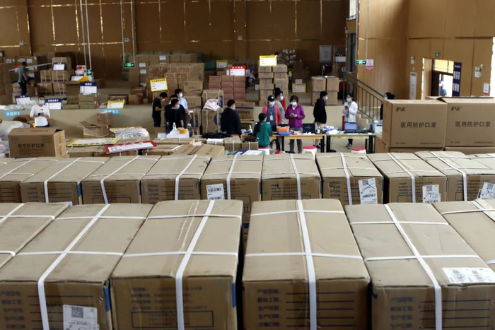 走进仓库,只见一箱箱口罩、手套、手消、酒精、消毒液等医疗物资高高垒起,塞满整个仓库。十多位戴着口罩、护目镜、面屏的工作人员正小心翼翼地装货、整理。