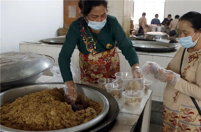 走进瑞丽市勐卯镇团结村等母村民小组活动场所厨房,大锅里的糯米饭热气腾腾,几名傣族大妈正在将糯米饭装进盒子里。“糯米饭的制作工序比较多,用时长,大多在节庆活动才制作。”傣族大妈李国萍忙碌着说,早上7点多开始制作,已经花了7个多小时。