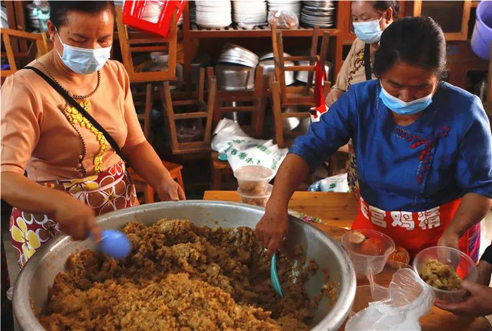 要制作这道傣家的传统美食,实属不易。傣族大妈要提前做准备工作,先用水将糯米浸泡。第二天大早将浸泡好的糯米蒸熟,再放入红糖水、熟花生、油,搅拌均匀后再放入锅中蒸,这些食材充分混合后,一道傣家美食才新鲜出炉。