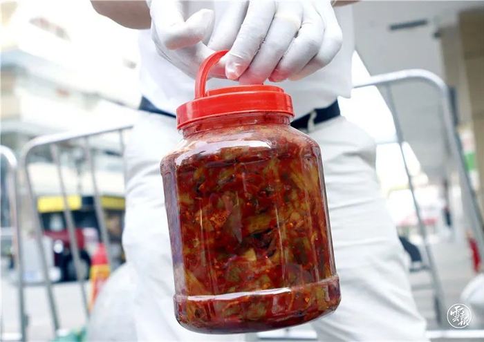 有村民把自家腌制的几罐酸菜也拿出来
