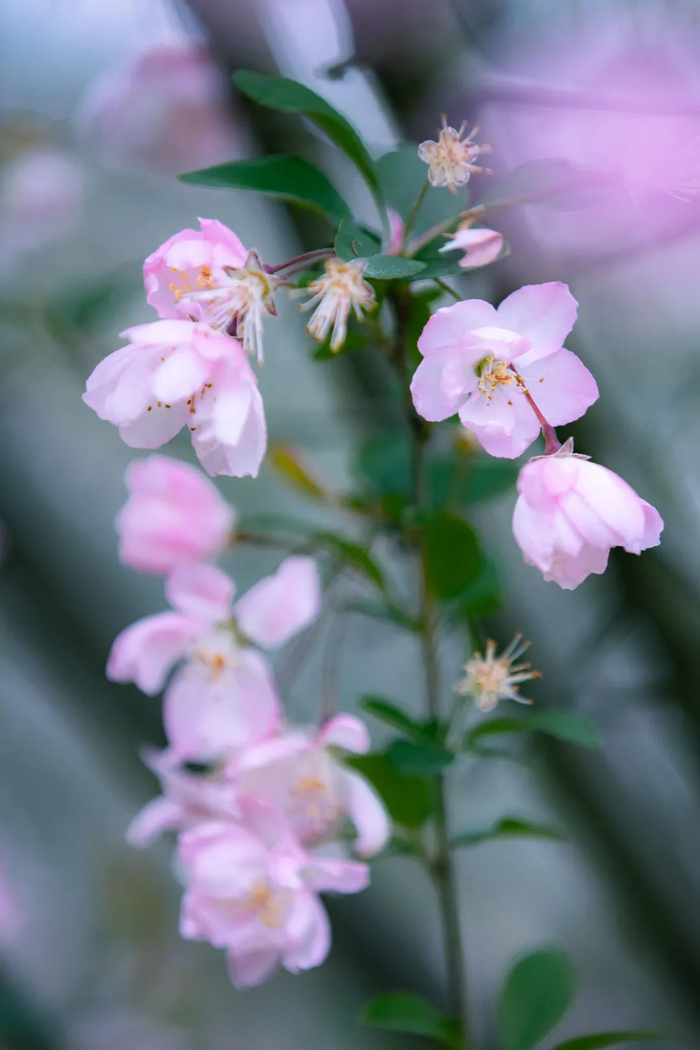 区分垂丝海棠与西府海棠:垂丝海棠正如其名,花是向下垂的,而且垂丝海棠为粉色,花梗偏紫红色。西府海棠花刚开为粉后逐渐转白,花梗绿色。