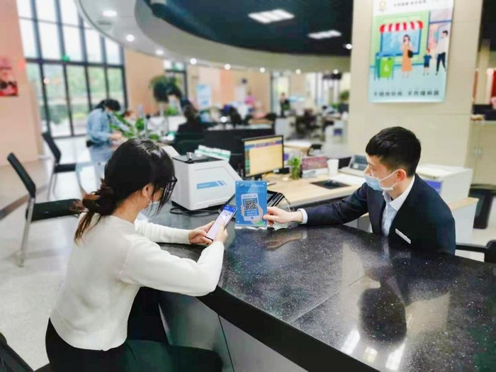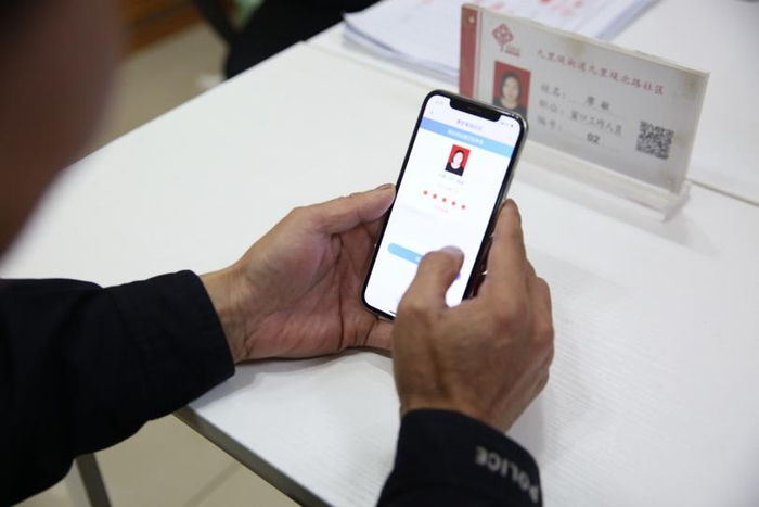 ↑群众在成都市金牛区九里堤北路社区办理事项结束后,对社区服务满意度在线打分。