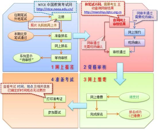 1.通过网上审核的,审核结果显示为“网上审核通过无需现场确认”。考生可登录教育部“中国教育考试网-中小学教师资格考试栏目”(http://ntce.neea.edu.cn)报名网页查看进度。进度为“待支付”状态的考生,可直接进行面试缴费。