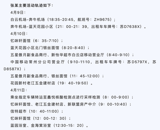 通报称,患者张某于3月26日自印度从广州入境,在当地接受14天隔离医学观察。4月9日,张某解除隔离后乘坐航班(航班号ZH9675)抵达常州奔牛机场,后乘坐出租车回到蓝天花园小区家中。4月11日,张某进行例行核酸检测,结果为阳性,后被诊断为无症状感染者。