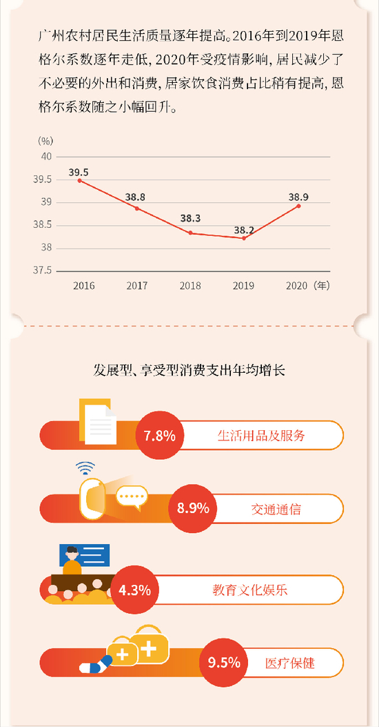 “十三五”时期,广州农村居民消费支出逐年增长,2020年人均消费支出达到22990元,累计增长44.4%,年均增长7.6%。广州农村居民恩格尔系数从2016年的39.5%下降至2020年的38.9%,下降0.6个百分点。