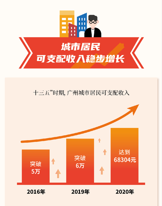 数据显示,“十三五”时期,广州城市居民人均可支配收入稳步增长,从50941元提高到68304元,年均名义增长7.9%,扣除价格因素,年均实际增长5.2%,与经济增长基本同步。虽然年均增速低于“十二五”时期,但绝对值在全省排位保持第一。