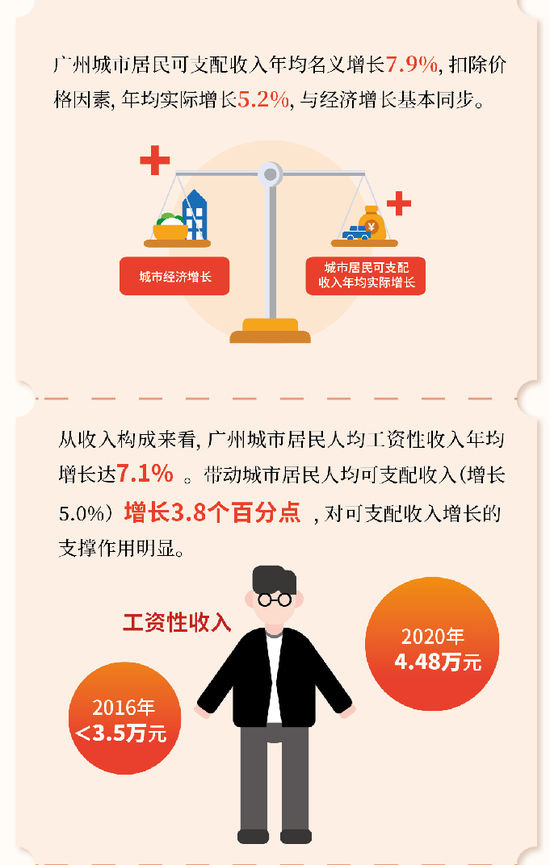 从收入构成来看,广州城市居民人均工资性收入从2016年的不足3.50万元增加到2020年的4.48万元,年均增长达7.1%,2020年带动城市居民人均可支配收入(增长5.0%)增长3.8个百分点,对可支配收入增长的支撑作用明显。