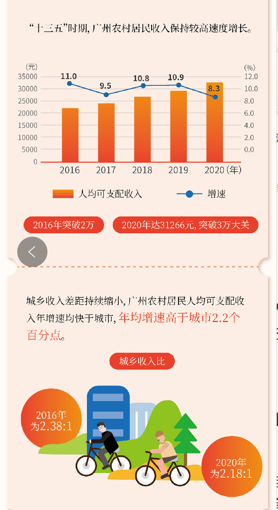 “十三五”时期广州农村居民人均可支配收入累计增长61.7%,年均增长10.1%,“十三五”期间,广州农村居民人均可支配收入水平一直处于全省前列,2020年广州农村居民人均可支配收入仅次于东莞、中山、佛山,位居第四,比2016年提升一位,增速(8.3%)位居珠三角片区第一位。