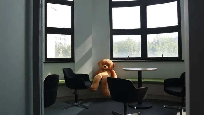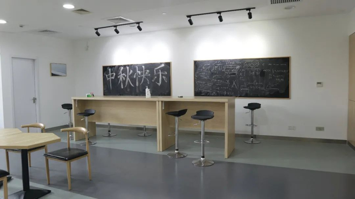 弧形的独立研讨室里,一只姜黄色的毛绒熊沐浴在阳光下微笑。吧台旁的黑板上,密密麻麻的公式和方程式还未被擦去,让人忍不住猜想,几分钟前是否有几个同学在这里一边喝着咖啡,一边低声讨论和演算。