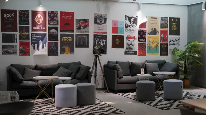 现代工业风的墙壁,画风多样的海报,店内大到雕塑、咖啡机、小到一个杯子乃至一张纸巾,都融入了Akimbo时尚新潮的文化元素。但布艺的沙发,随处可见的插座,又是为了让学习任务重的医学生有一个学习和放松的场所。