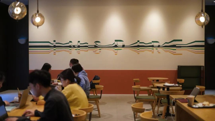 店内桌椅错落有致,主色调鲜亮,配合着专门为学校学生需求所设计的明亮温馨的橙黄色灯光,即使忙忙碌碌地学习工作坐上一天也心情舒适。