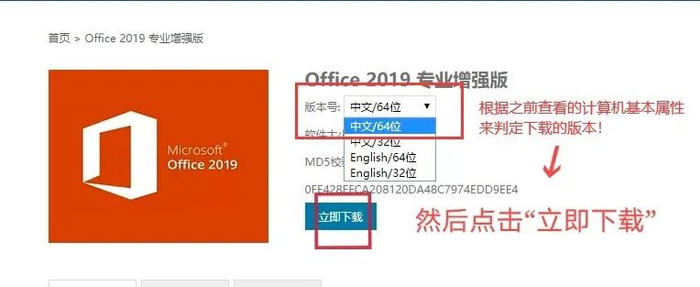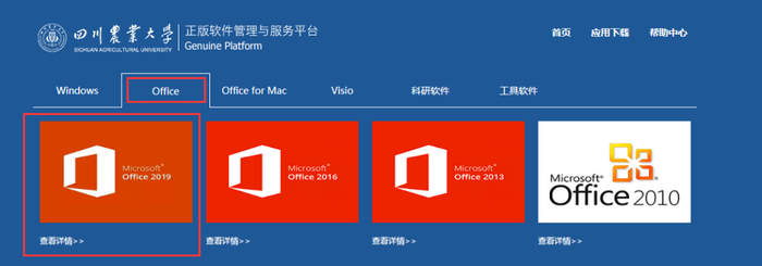 第二步:登录正版化系统下载适合本机的Office软件版本。(以下载Office2019为例)