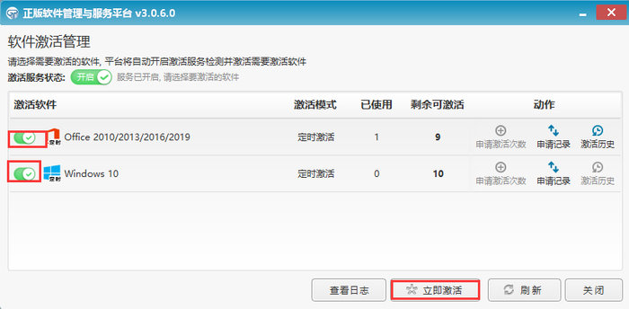 第四步:点击正版化系统页面“登录客户端”或直接运行“正版软件管理与服务平台”程序,打开你已成功安装的激活客户端,点击需要激活的软件进行实时激活。(windows和office默认各分配了10次激活次数,每激活成功一次就减一次)