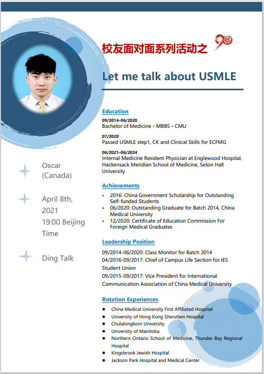 为充分挖掘与发挥留学生校友资源,打造我校精品国际教育品牌,同时,作为献礼中国医科大学90周年校庆系列活动之一,4月8日晚,通过钉钉群联播形式,国际教育学院开展了“校友面对面系列活动之Let me talk about USMLE”线上讲座与交流互动活动。学院邀请了2020届优秀毕业生代表Oscar Mu作为此次分享会的主讲嘉宾。全体国际学生辅导员和国际学生参加了本次活动。