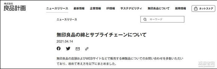 良品计划声明表示,向无印良品供货的新疆棉产区大小约5000公顷,对于该地区的农场等设施,我们已经查清了相关田地和工人的档案,对于人员计划也有了充分了解,并按照种植计划派出了第三方机构,去年还进行了监督检查。在迄今为止的监督检查中,我们没有发现任何严重违反法律法规或本公司行为准则的行为。