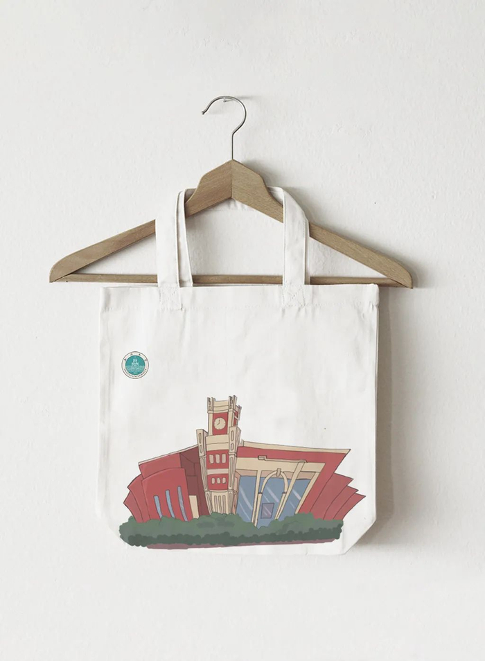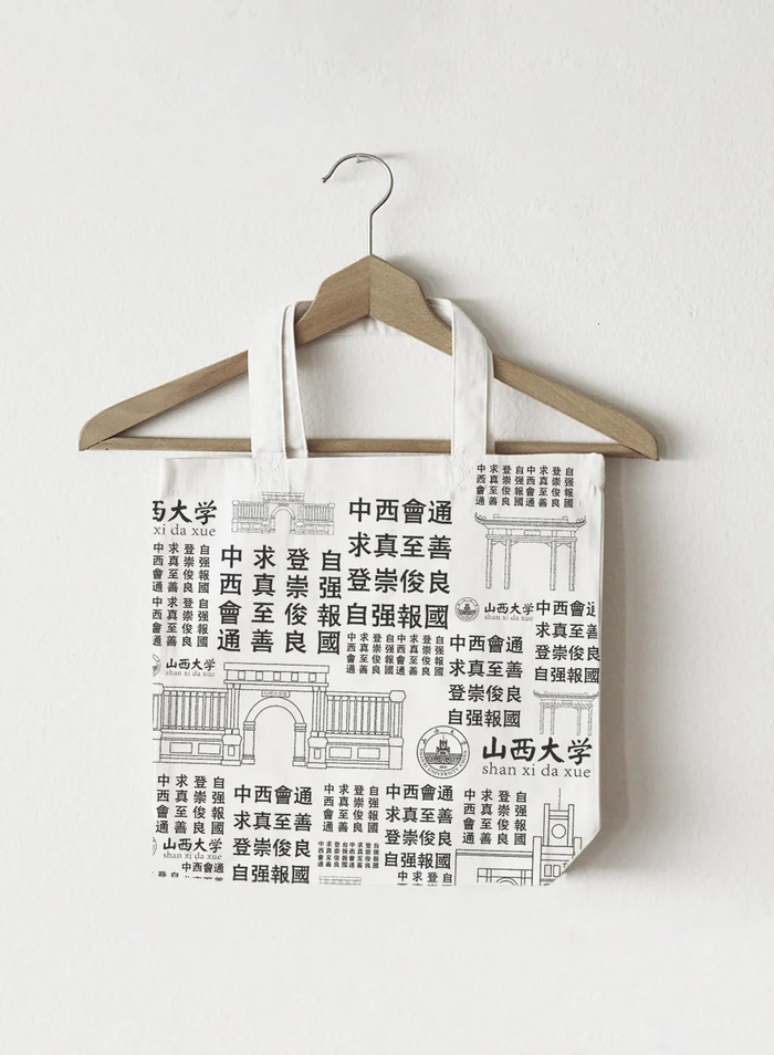 这款文创产品帆布包是以山西大学的建筑为基础,在抓住建筑特点的同时,运用萌化,文字,不同色彩的搭配等形式表达了对山大校园的热爱,多种手法的运用,为山西大学标志性建筑赋予崭新的意义与生命。