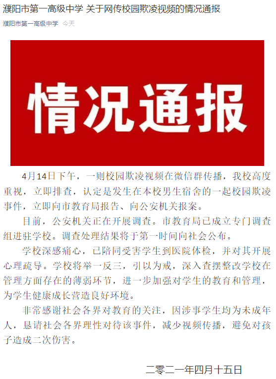 河南省濮阳市第一高级中学日前发布消息回应:4月14日下午,一则校园欺凌视频在微信群传播,我校高度重视,立即排查,认定是发生在本校男生宿舍的一起校园欺凌事件,立即向市教育局报告、向公安机关报案。