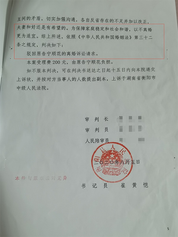 判决书显示,2020年8月5日,法院认为:“只要双方当事人正确对待婚姻家庭问题,冷静妥善处理相互间的矛盾,切实加强沟通,各自反省存在的不足并加以改正,夫妻和好还是有希望的。”法院以“为保障家庭稳定和社会和谐,以不离婚更为适宜”为由,驳回了宁顺花的诉讼请求。
