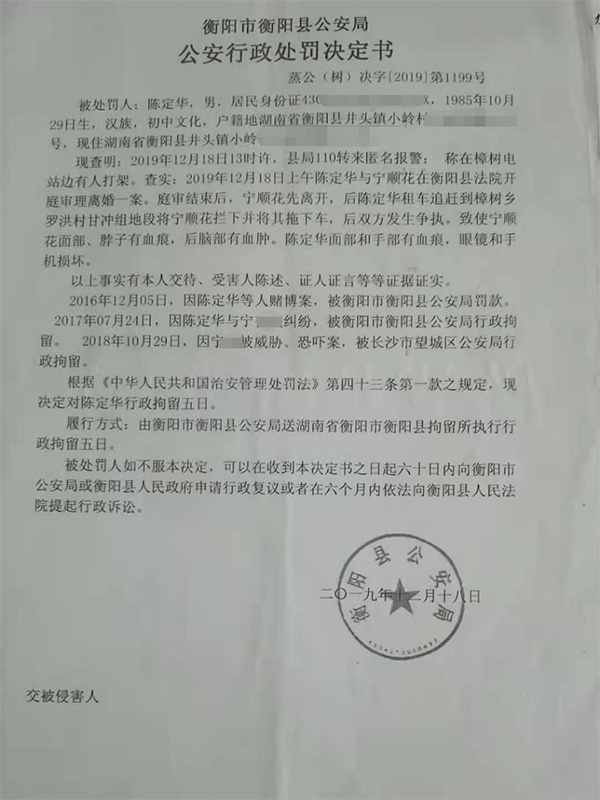 衡阳县公安局行政处罚决定书显示,宁顺花与陈定华离婚案开庭后,宁顺花被陈定华拦住拖下车。