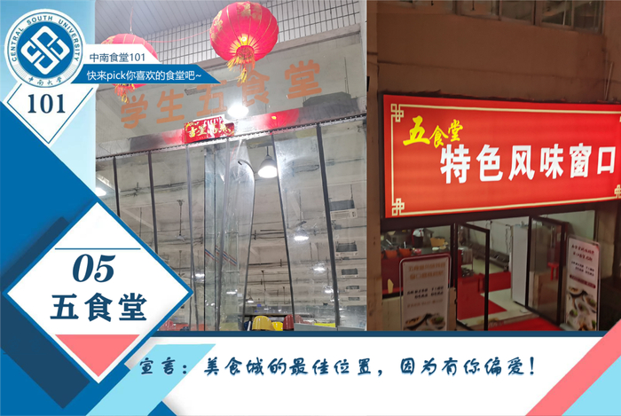 五食堂坐落在本部的“CBD区”,作为一个藏在本部里的食堂,也藏在历史里。用饭菜的清香带给你生活的满足,像林荫大道上透下的阳光,温暖宜人。食堂一楼(特色风味窗口)提供新式果拼、特色热卤、特色粥品、手工酸奶、冰糖葫芦。食堂二楼有各类菜式之外,还有特色的各地特色美食!食堂三楼的风味餐厅有各类菜式,按重量计价收费,这样既可以选择自己想吃的东西,又避免了浪费。简洁大气的装修风格、明亮轻快的色调、干净整洁的桌椅,营造出一种温馨舒适的氛围,如果心动就赶快去尝一尝吧!
