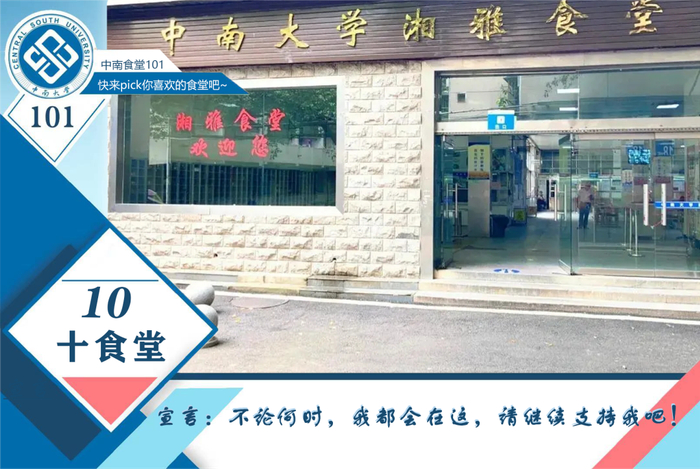 作为坐落在湘雅老校区唯一的食堂,湘雅食堂承载着一代代的美食寄托。诱人的酸辣鱿鱼卷、刺激味蕾的辣子鸡、或是最为朴素却又美味的水煮白菜都在呼唤你投入美食的怀抱。十食堂的菜品种类丰富,物美价廉。美食陪伴着湘雅人走过漫长岁月。