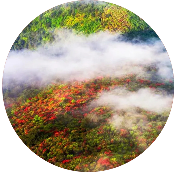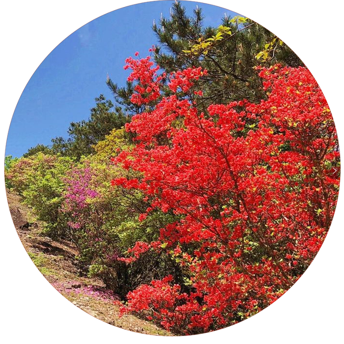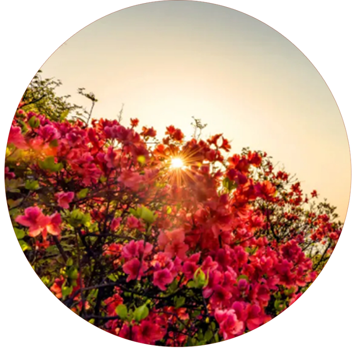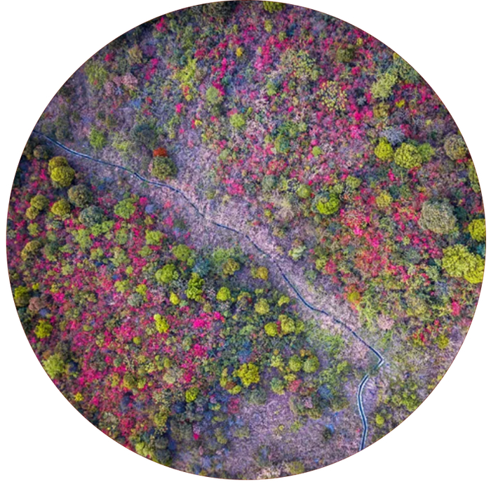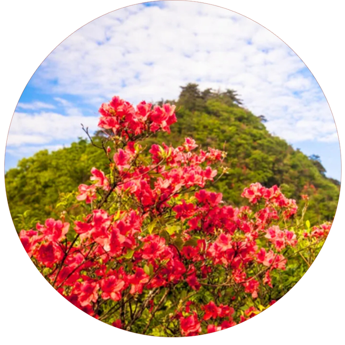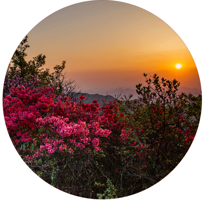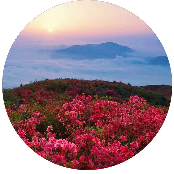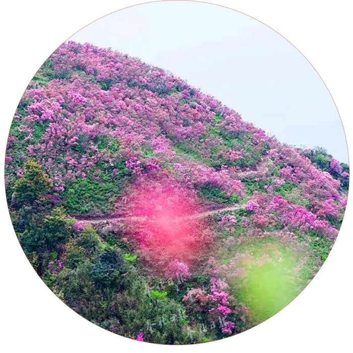 自丽水遂昌桃源村出发,杜鹃花由零星分布转为成片出现,连绵30多里。绿春湖名虽为湖,实却为山,从桃源尖、茅山坑到绿春湖一线的山脊两侧近十万亩杜鹃,海拔均在1300多米以上,是衢州成片规模最大的高山野生杜鹃。