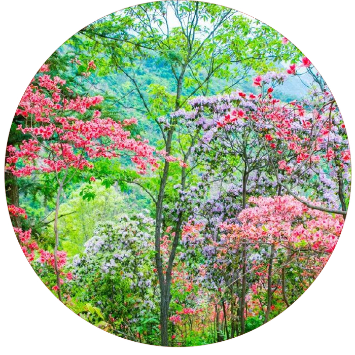 相较于大平岗高山杜鹃群,际头坞杜鹃谷的杜鹃种类更加多些。红的、紫的、白的,斑斓的色彩掩映在一片碧绿的林间,装扮了整个山谷沟壑。