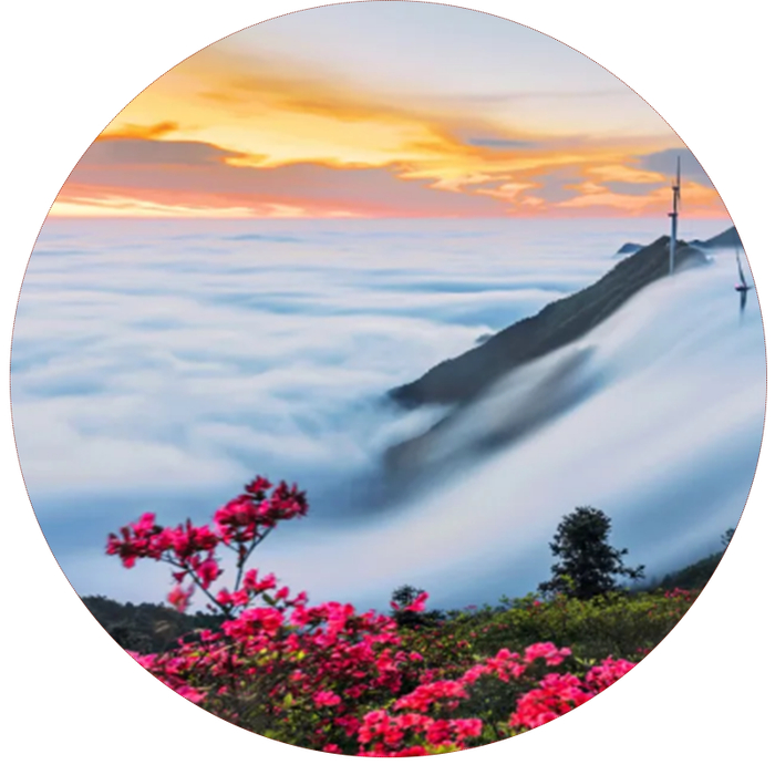 白鹤尖著名的景观当属杜鹃花与云海,山峦两侧有23台风机在山顶呼呼旋转。一动一静之间,有着说不尽的浪漫。