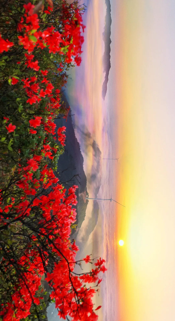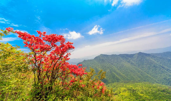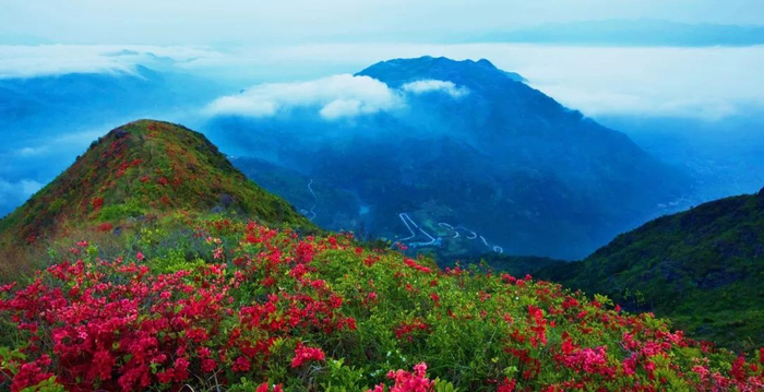 花开时,在山脊迎风而立,映入眼帘的是十里杜鹃红胜火。