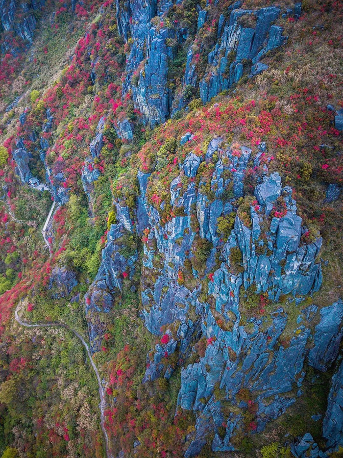 从山下的大坞村沿着登山小道拾阶而上,春风拂面,泉声潺潺,绿树青山中片片火红灿若红霞,正如杨万里的诗句“一路山花不负侬”。