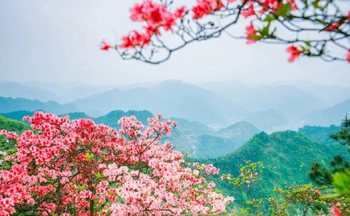 桃源七里的杜鹃主要开在大平岗的山头和际头坞的山谷里。一到4月中旬,海拔1200米的高山之巅上,一条徒步廊道贯穿其上。两旁的千亩杜鹃花丛尽数开放,红得轰轰烈烈。