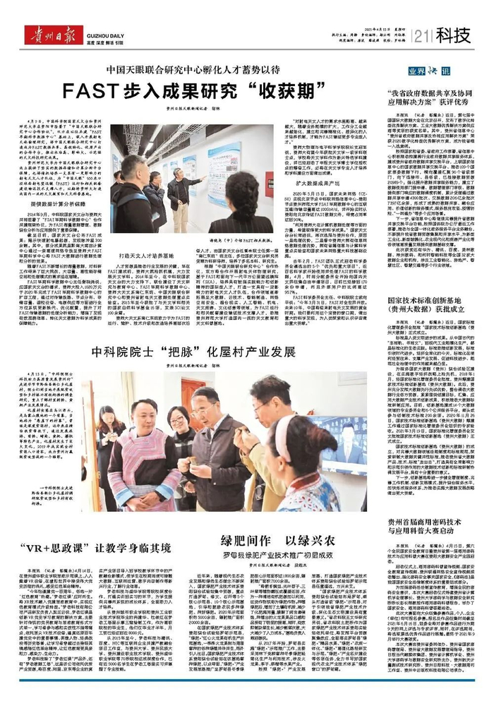 4月15日,《贵州日报》发了题为《中国天眼联合研究中心孵化人才蓄势以待 FAST步入成果研究“收获期”》的报道。文章写到:4月9日,中国科学院国家天文台和贵州师范大学在贵阳市签署了“中国天眼联合研究中心合作协议”,双方在以往共建“FAST早期科学数据中心”基础上,深入开展射电天体物理研究,将中国天眼联合研究中心打造成为FAST数据共享、高效转化、优质产出的合作平台,推出水准高、影响大、示范强的天文科技研究成果。贵州师范大学为中国天眼联合研究中心成立提供了坚实的数据存储和计算分析平台保障,也将借机培养一支具有一定影响力的射电天文人才队伍,为“中国天眼”500米口径球面射电望远镜(FAST)运行和相关配套建设输送技术支撑人才,以期将贵师大打造成国内一流的天文教育和天文科普基地。