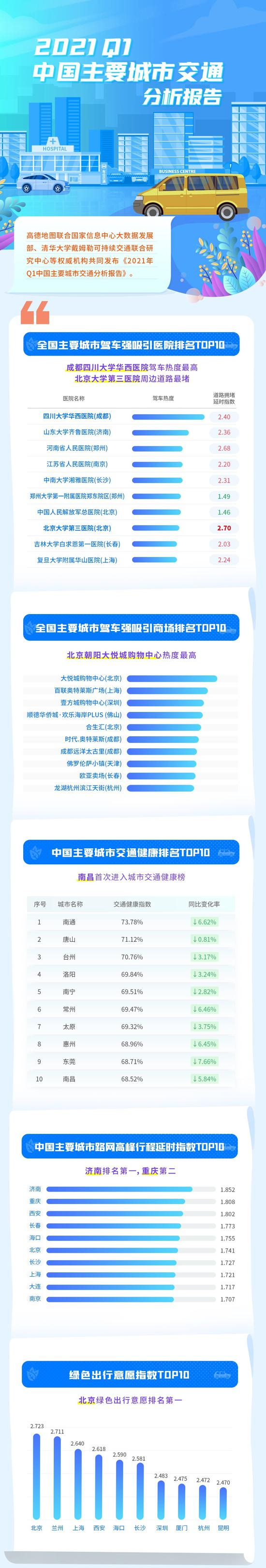 报告还列出了全国十大驾车热门商场,全国主要城市驾车强吸引商场中,北京朝阳大悦城购物中心自驾热度最高,其次是上海百联奥特莱斯广场、深圳壹方城购物中心等。医院和商场一直是出行需求较高的目的地,全国十大自驾热门医院中,位于北京的中国人民解放军总医院、北京大学第三医院分别排名第七位和第八位。