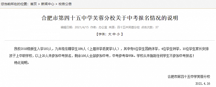 合肥市第四十五中学芙蓉分校在其官方网站发布说明信息称,该校2018级新生入学183人,九年级在籍学生186人(上届休学后复学3人),其中有6位学生因病休学,4位学生转学,10位学生家长安排孩子上中职学校,以上20人未参加中考报名,剩余166人全部参加中考,中考参考率95%。