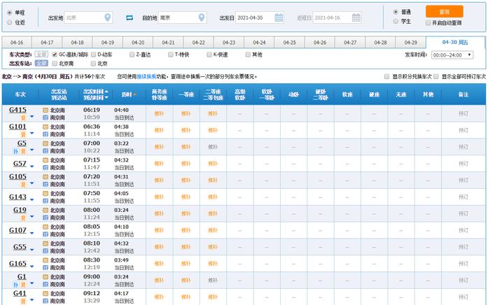 据铁路部门预计,五一假期主要以中短途旅游、探亲、学生客流为主,节日期间车票将会比较紧张。据官网,4月29日、30日当天一些热门线路的车票已经售罄。例如,今天12:30开售没多久,4月30日北京至郑州、长沙、南京等方向的高铁、动车便已售罄。