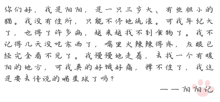 万物生而有灵,希望喜欢小动物的人们能在自己力所能及的情况下去收养一只山师猫,也希望大家尽可能带流浪猫做绝育手术。希望像阳阳这样受到伤害的流浪猫少一些、再少一些。
