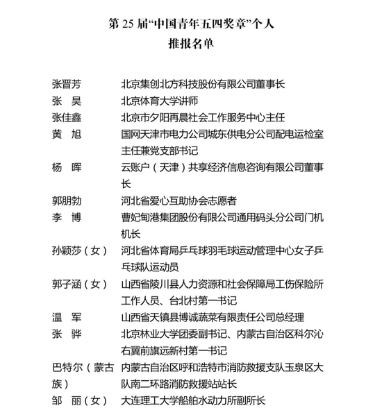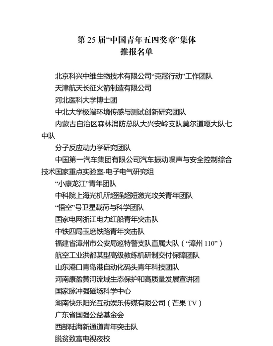 第25届“中国青年五四奖章”个人(集体)入围名单公示