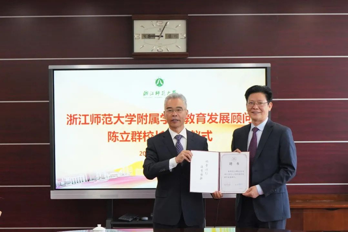 陈立群校友受聘为浙师大附属学校教育发展顾问,李伟健为陈立群颁发聘书。
