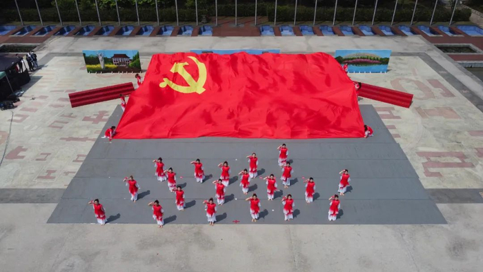 舞蹈《鲜红的党旗》在铿锵的乐曲声中绽放。承载着无数革命先辈血泪的党旗,是铭记,是弘扬,也是传承。